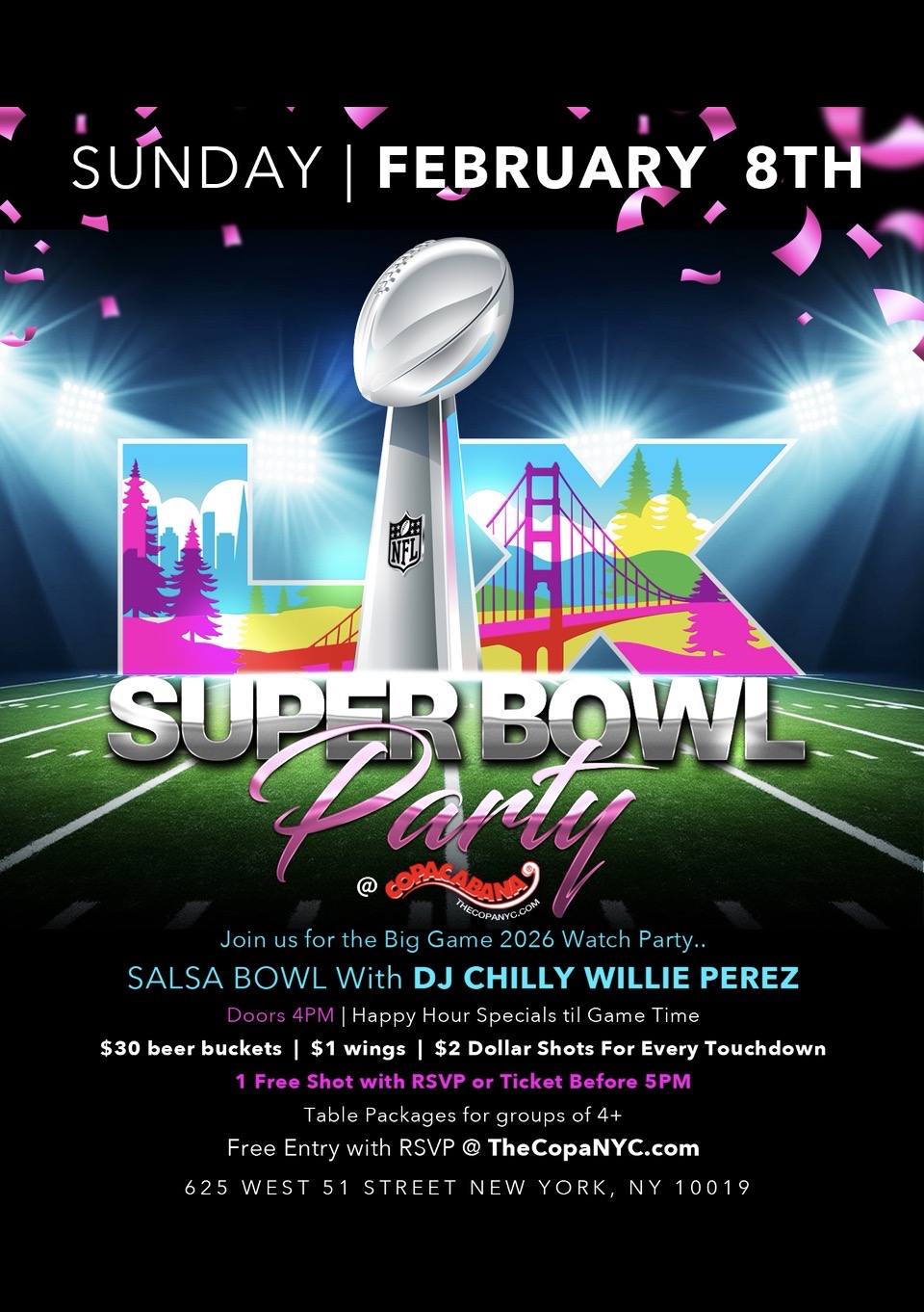 Sunday Feb 8th 4pm. Join us for the Bad Bunny Salsa Bowl Party with Dj Chilly Willie & Guest